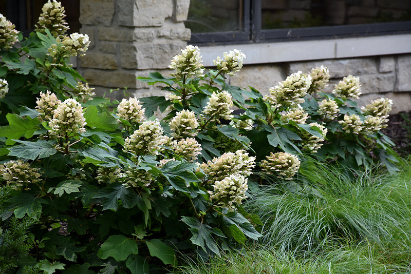 An excellent compact garden or massing shrub featuring spikes of mixed sterile and fertile flowers which mature from pure white to pink, interesting foliage with spectacular fall color and papery bark; rather coarse in appearance, best used in groupings